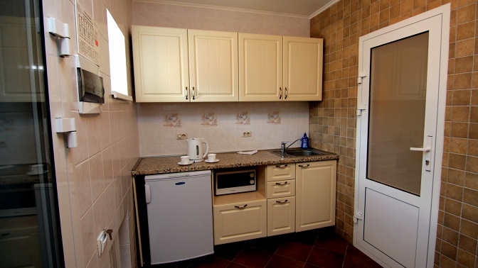 — кухонная зона с электроплитой и набором посуды;